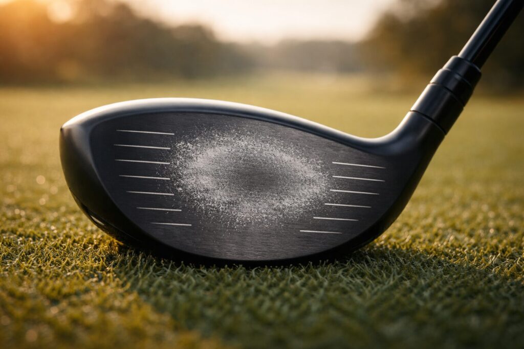 フェース全体に打点チェックスプレーを吹いてから打つと、当たった場所がくっきり残ります。10球打って打点の分布を確認し、写真で記録しておくと比較がしやすいです。