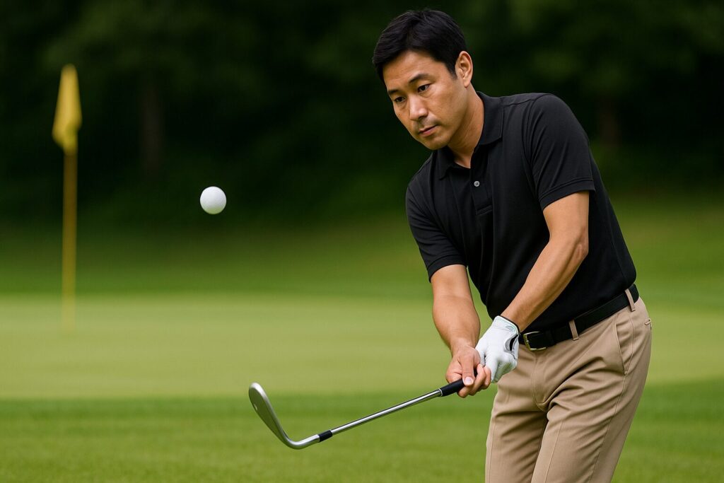 これは、芝の抵抗が強い状況や、下り傾斜で転がしたい時にとても有効です。ヘッドが自然にボールを包み込むように入るので、トップミスを減らしたい人にもおすすめ。